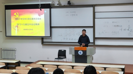 2020年11月4日,微电子学院本科生一支部和本科生二支部联合举办主题党日活动,学习贯彻党的十九届五中全会精神。本次活动由本科生二支部党支部书记、学生辅导员黄佛保老师主持,学院全体本科生党员参加了此次主题党日活动。