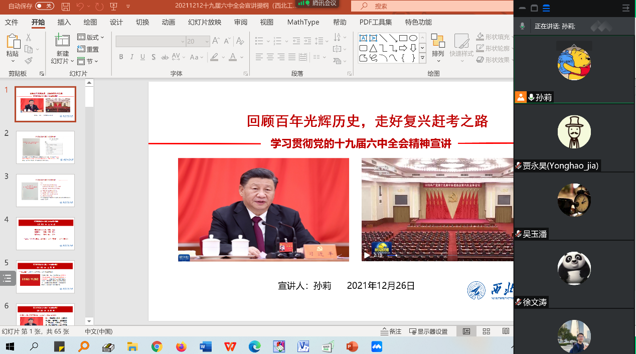2021年12月26日,微电子学院师生联合二支部深入学习贯彻党的十九届六中全会精神,由支部书记孙莉为支部党员同志讲授党课“回顾百年光辉历史,走好复兴赶考之路——学习贯彻党的十九届六中全会精神宣讲”。本次党课活动全体党员同志按时参加,考虑到微电子学院两地办学情况,部分老师出差在途,本次会议采用互联网+的形式通过腾讯会议召开,会议由支部书记孙莉主持。