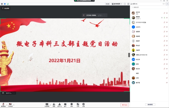 1月21日,微电子学院本科三支部在线上召开微电子本科三支部2022年第一次主题党日活动,活动围绕“榜样的力量”这一主题,引导同学们学习身边的优秀学生党员代表。
