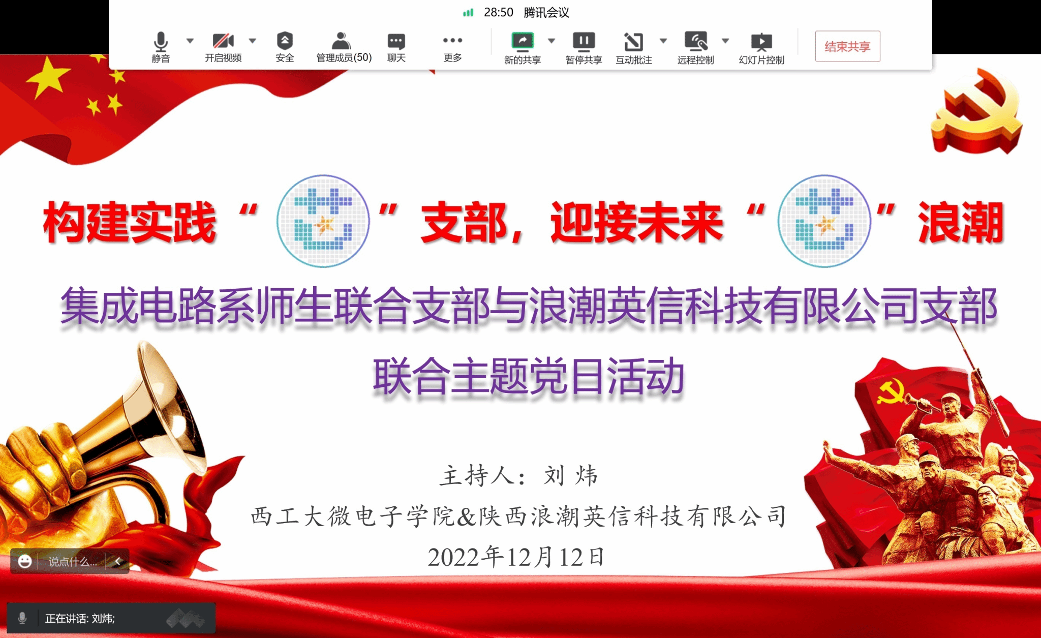 为了深入贯彻落实党的二十大精神,进一步加强与行业内一流企业的联系与沟通,同时,提高支部成员专业素质,开阔同学们的专业视野,2022年12月12日下午,微电子学院集成电路系师生联合支部与陕西浪潮英信科技有限公司支部以“构建实践‘芯’支部,迎接未来‘芯’浪潮”为题,通过腾讯会议平台,举办了一次线上联合主题党日活动。本次活动由支部书记刘炜同志主持。活动开始后,主持人刘炜同志首先介绍了举办此次支部联合主题党日活动的背景和意义,以及参加本次活动的行业资深专家、集成电路系教师代表,以及硕博士研究生党员等主要参会人员情况。