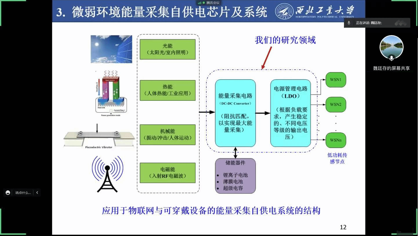 活动第三项是由微电子学院博士生导师,“微电子科学与工程”学科带头人魏廷存教授向大家介绍了团队在高频数字电源智能控制芯片及系统、辐射探测器前端读出芯片与微弱环境能量采集自供电芯片的相关研究。之后,系主任马彦昭老师也向大家介绍了西工大微电子学院的历史沿革及发展现状,并介绍了集成电路系近几年的发展状况,之后,重点介绍了其团队在电源管理芯片、混合集成电路设计等方面的科学研究成果。