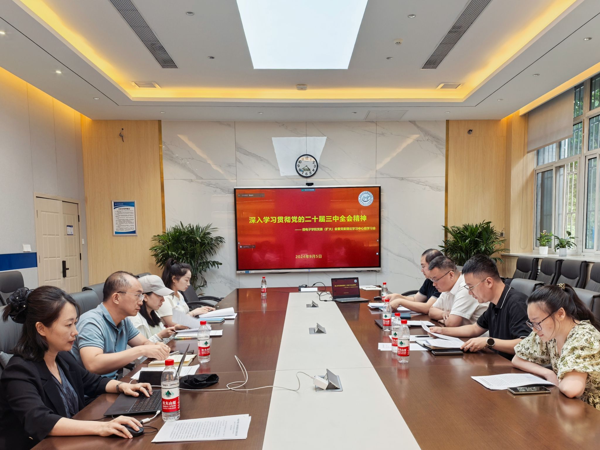 9月5日,微电子学院召开党委(扩大)会议暨党委理论学习中心组学习会,学习贯彻党的二十届三中全会精神。学院党委委员和全体党支部书记参会,会议由学院党委副书记余鹏主持。