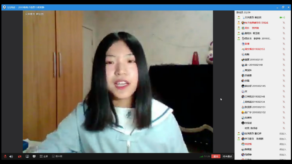 最后,团支书李彦桦同学对班委和同学们的发言进行了总结,并以自身为例提出了一些切实可行的建议。辅导员兼班主任汪钰成老师亦提出在此特殊时期,同学们也应多关心身边人,珍惜相处的时光。