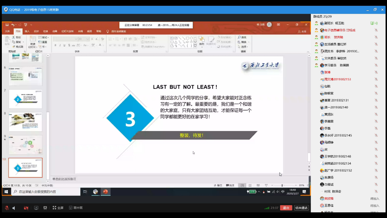 学习委员陈展鹏同学讲述了居家线上学习该如何达到更好的效果,并强调了学习心态的重要性,提醒大家虽然居家学习舒适也不可过于放松,面对新学习方式带来的一些问题也要积极克服,努力达到同在校学习相同的效率。其组员也提出了在家学习遇到的许多问题——独自学习缺少动力、设备问题降低学习效率等,但都表示会认真克服,希望尽早回到学校。组员赵广宇同学也同大家分享了许多学习软件,以帮助同学们更好地管理学习时间。