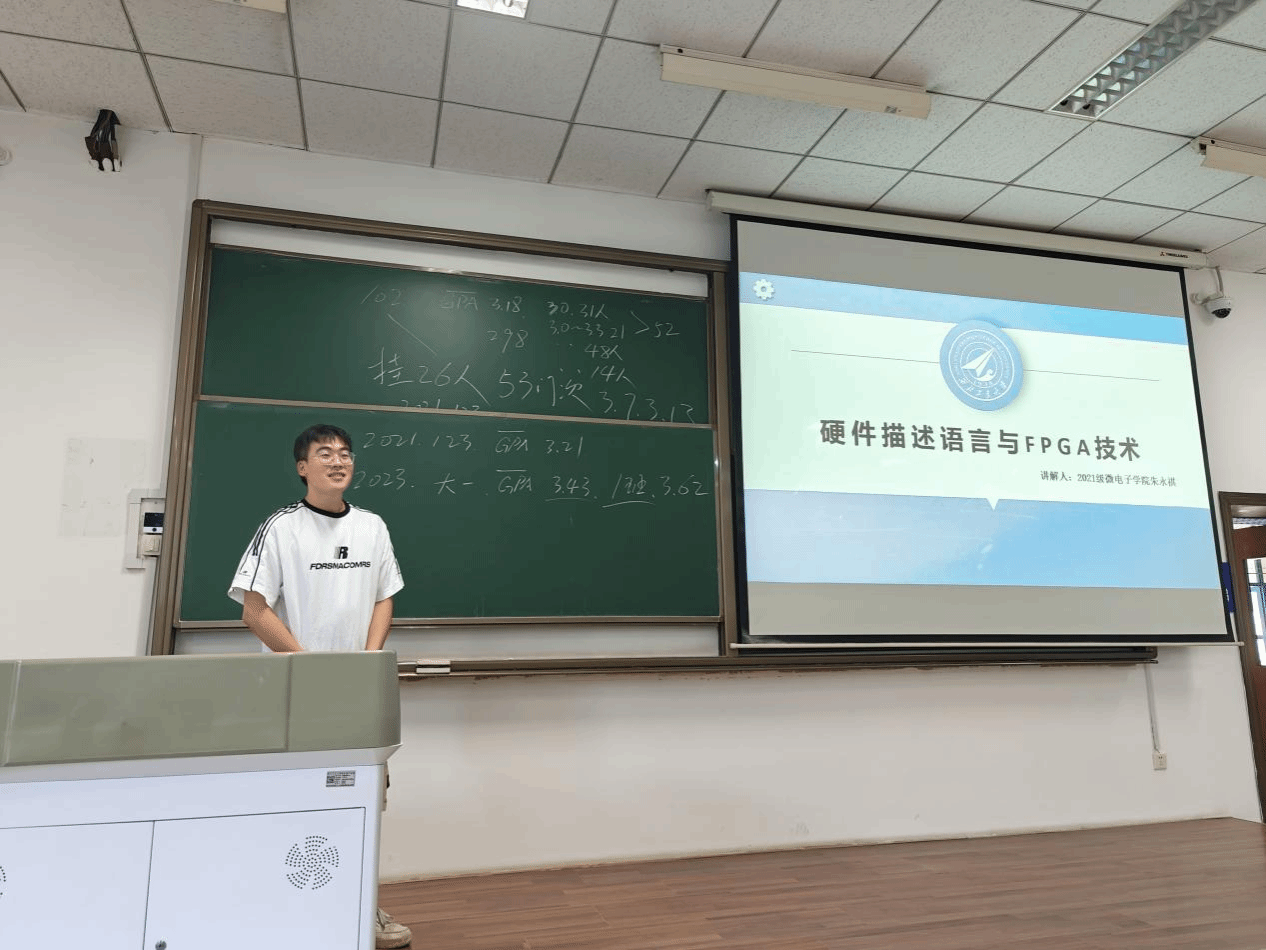 朱永祺同学以《硬件描述语言与FPGA技术》为重点,详细介绍了该专业课的学习大纲、考察重点、考试复习的注意事项。根据自身经历,朱永祺建议2022级的学弟学妹们能深入理解课程内容,掌握代码编写的思路和原理,他认为学好该门课程对以后有志于参加数字电路设计竞赛或本科就业具有非常积极的意义。