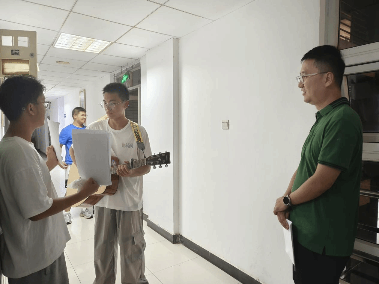 学院苏春昊同学为了表达对老师们的欢迎和感谢,在宿舍走廊现场弹奏吉他,吸引了众多同学围观。同学们纷纷表示,希望在学院老师们无微不至的关怀下,努力成长、力争上游,不辜负老师和家长的殷切期望。