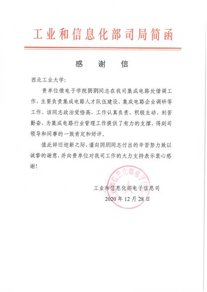 2020年12月28日,工业和信息化部电子信息司向我校发来《感谢信》。信中对阴玥同志在借调期间,以坚定的政治信念、精湛的专业水平、认真负责的工作态度,完成司里安排的集成电路人才队伍建设、集成电路企业调研等工作,给予了肯定和鼓励。这是工业和信息化部对阴玥同志辛苦努力工作表示的认可,也是对学校和微电子学院支持工业和信息化部工作的感谢!