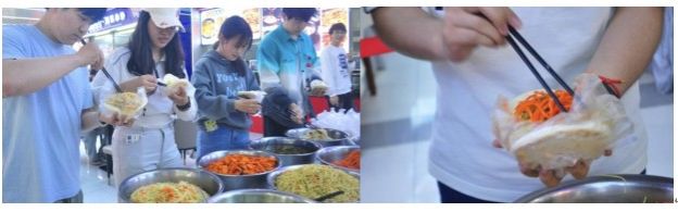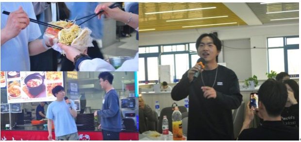 竞赛环节热闹有序,各队伍喊出专属口号后,按抽签顺序依次制作称重。选手们精准把控分量,个人赛尽显“稳手”功底,团队赛四人协同发力,现场欢声笑语不断。参赛同学完成比拼后,围坐分享亲手制作的菜夹馍,更有同学即兴献唱助兴,氛围其乐融融。