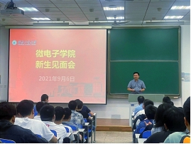 为了帮助新生更好地了解学院,适应新环境,微电子学院于9月6日下午召开2021级本科生及研究生新生见面会。院长周德云、党委副书记(主持工作)甘雪涛、副院长王少熙、党委副书记高武、副院长周世钢,研究生辅导员梁秋菊、大一辅导员汪瑛以及全体2021级新生参与了本次见面会。会议由党委副书记高武主持。