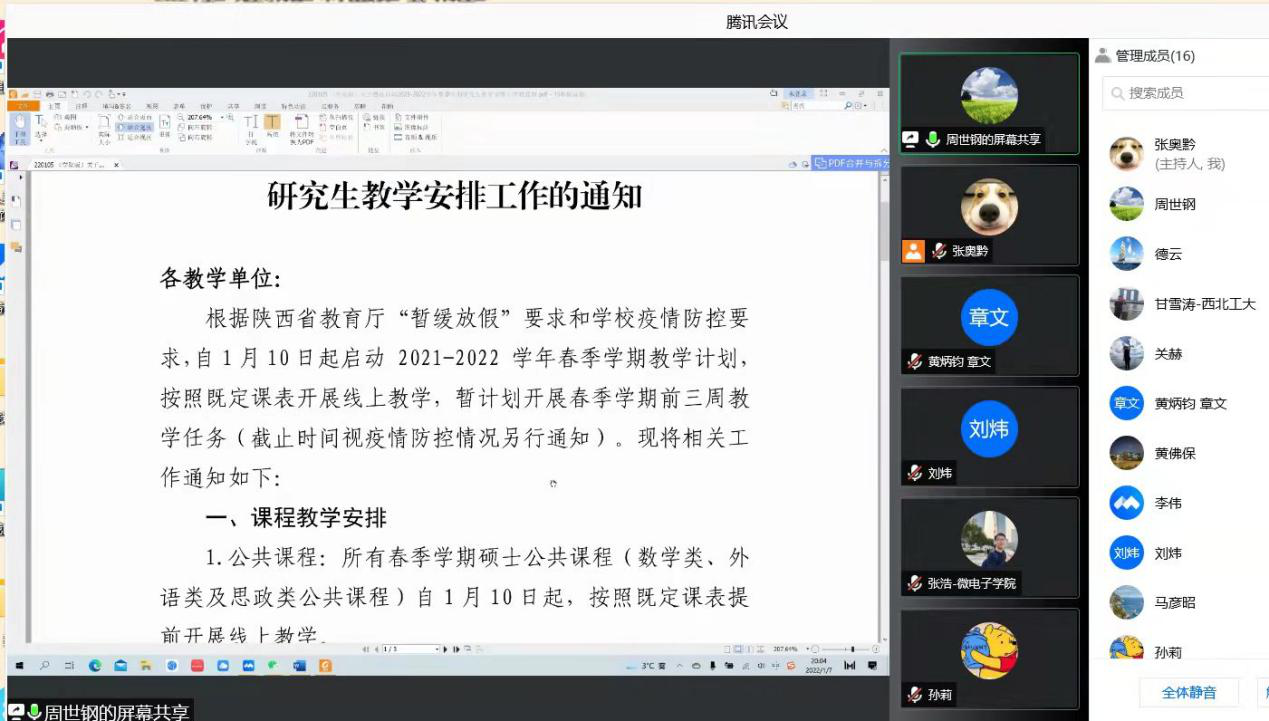 为保证疫情期间研究生教育教学工作的顺利开展,1月7日晚8:00微电子学院召开了疫情期间研究生教学工作部署会。学院院长周德云、党委副书记(主持工作)甘雪涛、副院长周世钢、全体研究生导师及任课教师参加了会议,会议由周世钢副院长主持,采用线上形式展开。