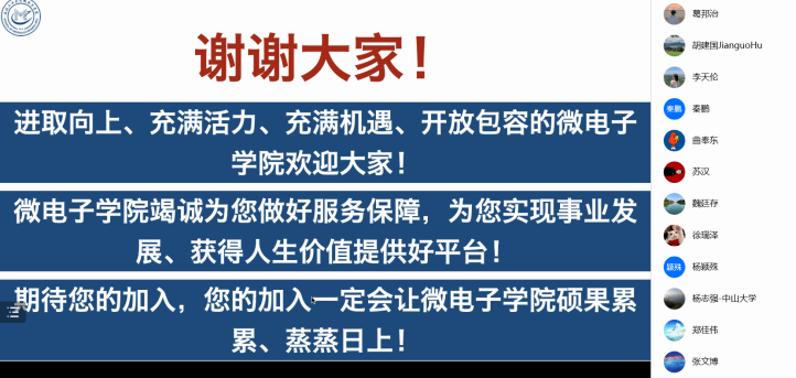 最后,甘雪涛作总结发言,他再次对各位学者的到来表示感谢,同时真诚地希望各位优秀青年学者加盟微电子学院,与学院展开深入的交流合作,微电子学院竭诚为各位青年才俊做好服务保障,提供优秀的教书育人和学术发展平台,共同推动微电子学院高质量发展。