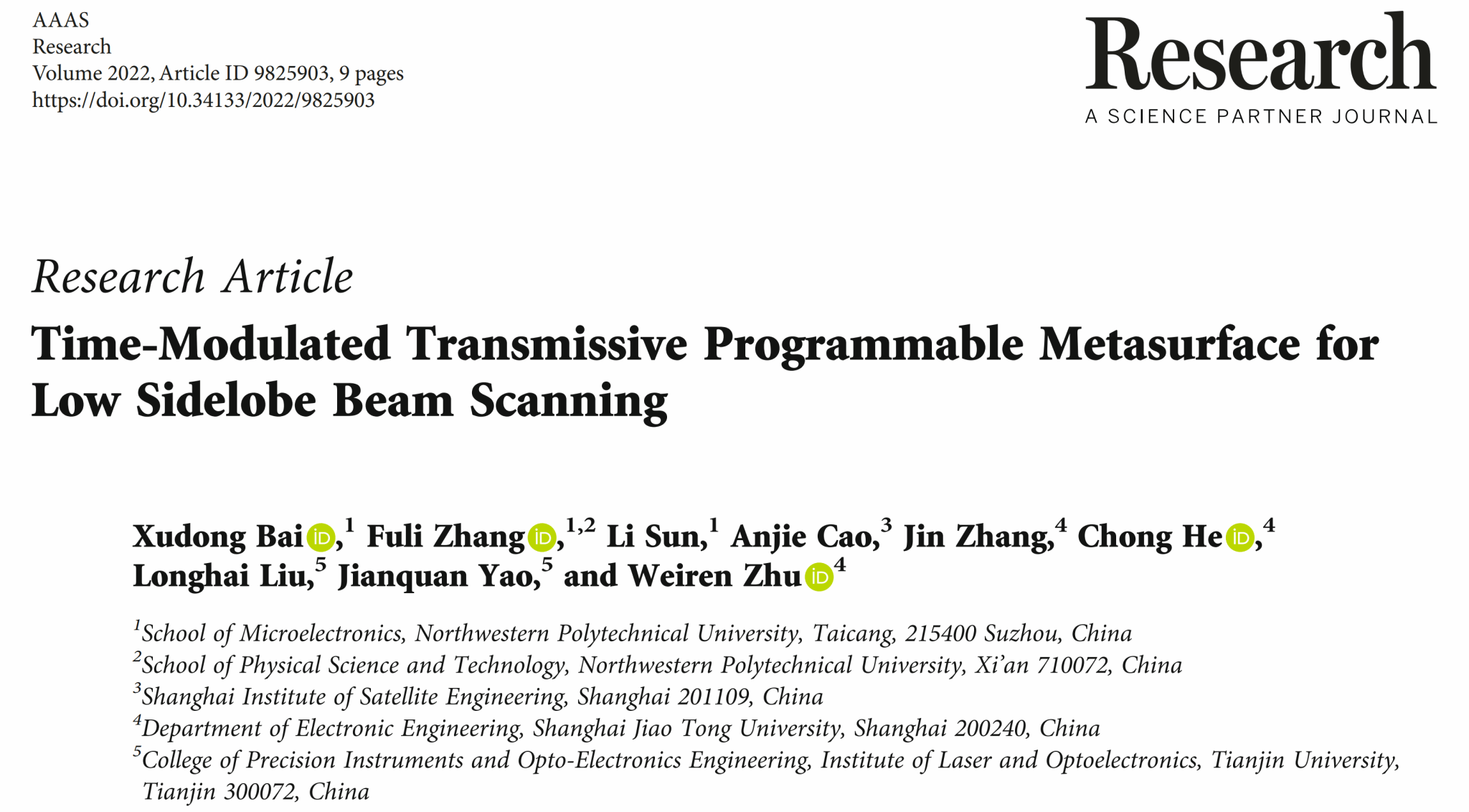 自入职以为,白旭东老师全身心投入科学研究中,他深知,只有取得足够多的科研成果,才能不断提升自己,进而以更加充足的理论和实践基础教书育人。一年以来,白老师在高效率低剖面数字超构表面研究取得了丰硕的成果,以第一作者在中科院一区期刊《Research》、《Laser & Photonics Reviews》、《Nanophotonics》发表学术研究论文3篇,以共同一作或通讯作者在《Optics Express》、《IEEE Antennas and Wireless Propagation Letters》、《ACS Applied Electronic Materials》发表学术研究论文3篇。作为第一完成人或者单位负责人获批了上海市科委基础研究课题1项,上海航天局军口横向课题1项,太仓市科委面上项目1项。同时参与了全球性技术联盟组织智能超表面技术联盟(RISTA)的智能超表面技术白皮书的撰写。