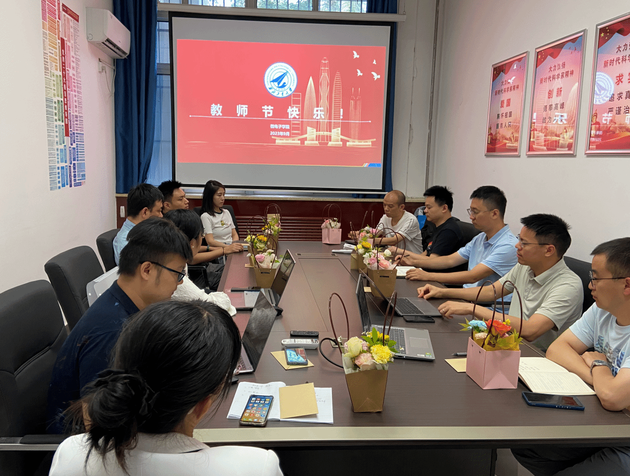 为庆祝第39个教师节及进一步加强学院师德师风建设,增强教师职业荣誉感和使命感,微电子学院于9月8日上午召开庆祝教师节座谈会,党委书记甘雪涛、副书记余鹏及学院长安校区十余名青年教师参加了会议,太仓智汇港教师线上参会,座谈会由甘雪涛主持。