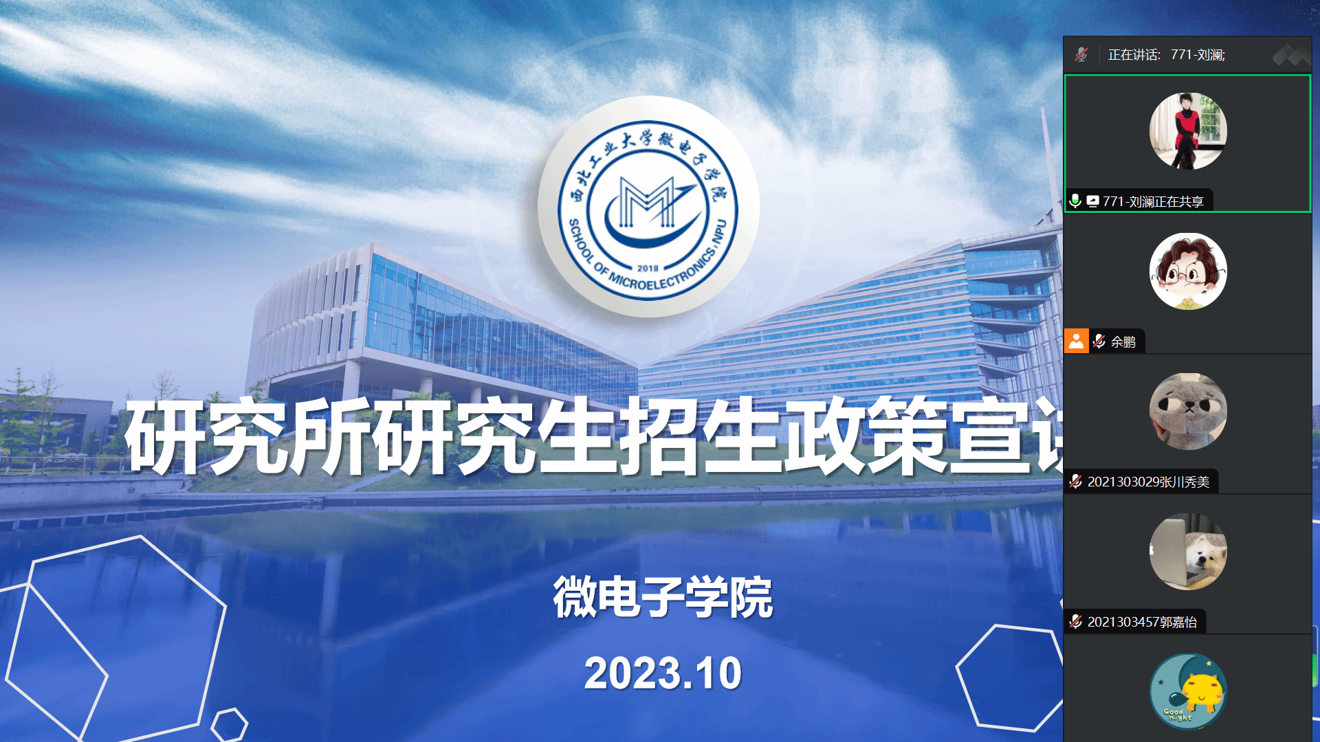 10月18日晚,微电子学院邀请西安微电子技术研究所(771所)、北京微电子技术研究所(772所)面向学院大三、大四学生进行所招研究生政策宣讲。771所人力资源部副部长兼研究生部主任刘澜、772所研究生教育主管王科迪参加会议,会议由学院党委副书记余鹏主持。