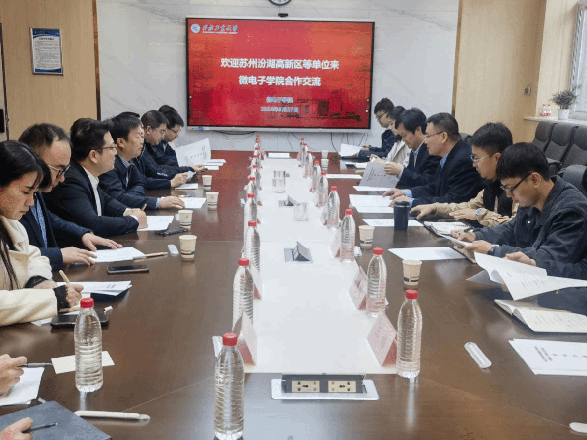 2024年3月27日上午,苏州市汾湖高新区党工委委员、管委会副主任吴伟斌带领高新区多个部门和企业代表莅临微电子学院交流座谈。