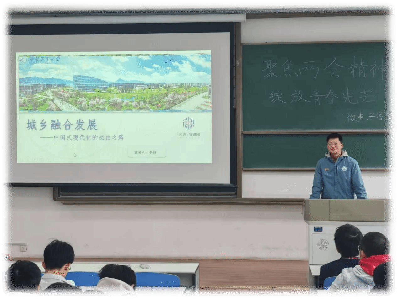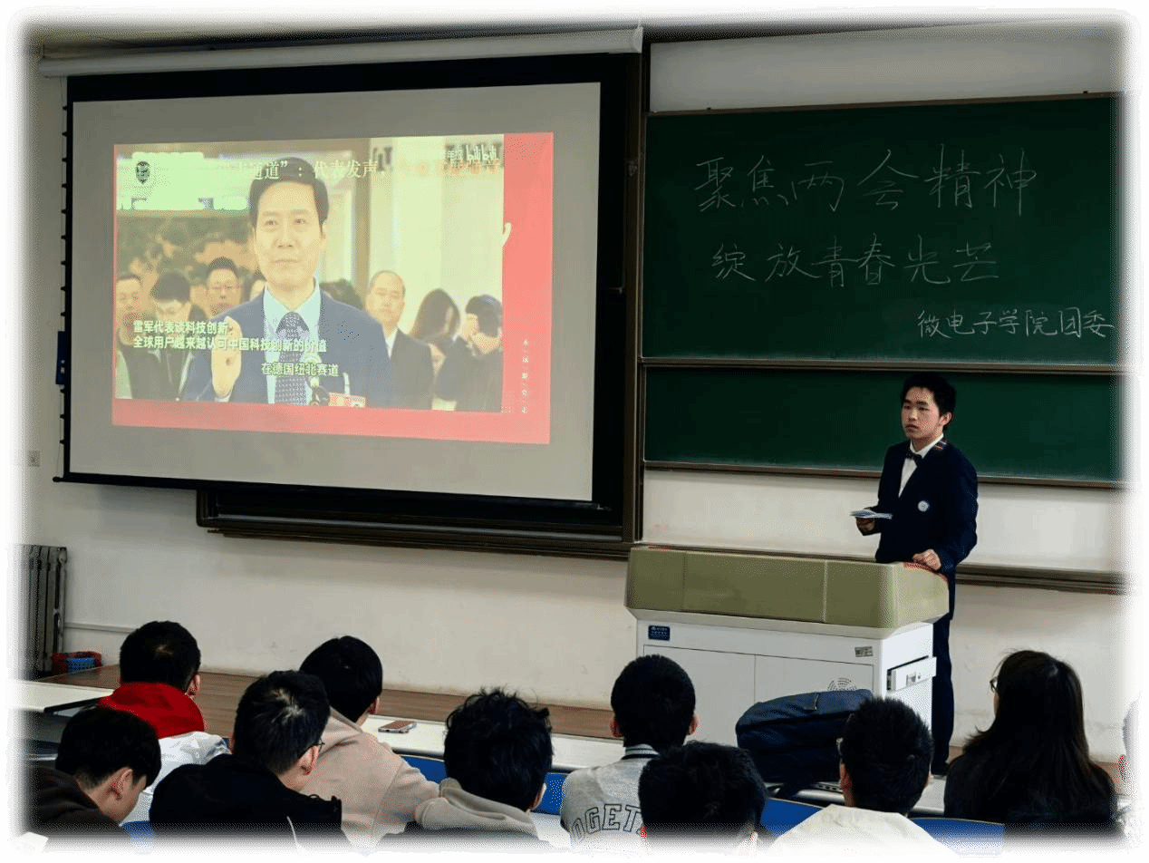 3月22日,在学院团委的指导下,微电子学院2024级联合芯声宣讲团在长安校区教学东楼D1-203举办“聚焦两会精神,绽放青春光芒”主题团日活动。活动由蒋涵和周墨涵主持,微电子学院2024级全体学生参与。活动还邀请了芯声宣讲团负责人李喆宣讲。