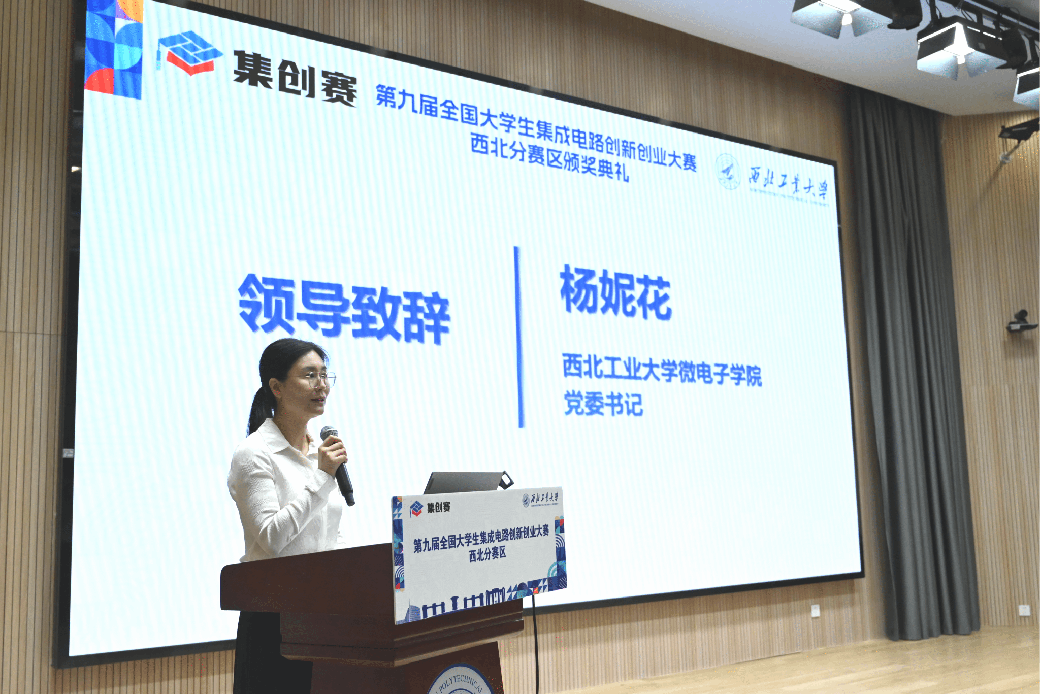 杨妮花在致辞中介绍了学校、学院发展情况,肯定了参赛学生的优异表现,同时希望参赛学生通过大赛有所收获和留下宝贵经历,在未来以“芯”力量赋能科技强国,以“创”精神书写时代答卷。
