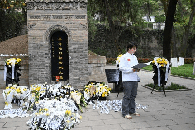 在集体献花仪式上,全体师生于杨虎城将军墓碑前肃立默哀一分钟,怀着无比崇敬的心情向革命先烈深深鞠躬,随后依次缓步敬献鲜花,寄托对革命先烈的无尽追思与崇高敬意。